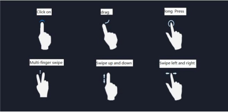The gestures that the machine can recognize are mainly divided into short-press, long-press, drag, and slide types. The results of the same function under different gestures are different, and the user operates the machine by touching the display screen.
